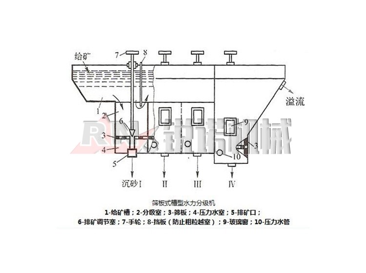江西銳諾篩板式槽型水力分級(jí)箱又稱丹佛型水力分級(jí)箱,是利用篩板造成干涉沉降條件的設(shè)備,機(jī)體外形為一角錐形箱,箱內(nèi)用垂直隔板分成4-8個(gè)分級(jí)室。每個(gè)室的斷面積為200×200mm,在距室底一定高度處設(shè)置篩板。篩板上鉆有 36-72個(gè)直徑為3-5mm的篩孔。壓力水由篩板下方給入,經(jīng)篩孔向上流動(dòng)。在篩板上方懸浮著礦粒群,進(jìn)行干涉沉降分層。粗顆粒通過篩板中心孔排出,排出量用錐形塞控制。